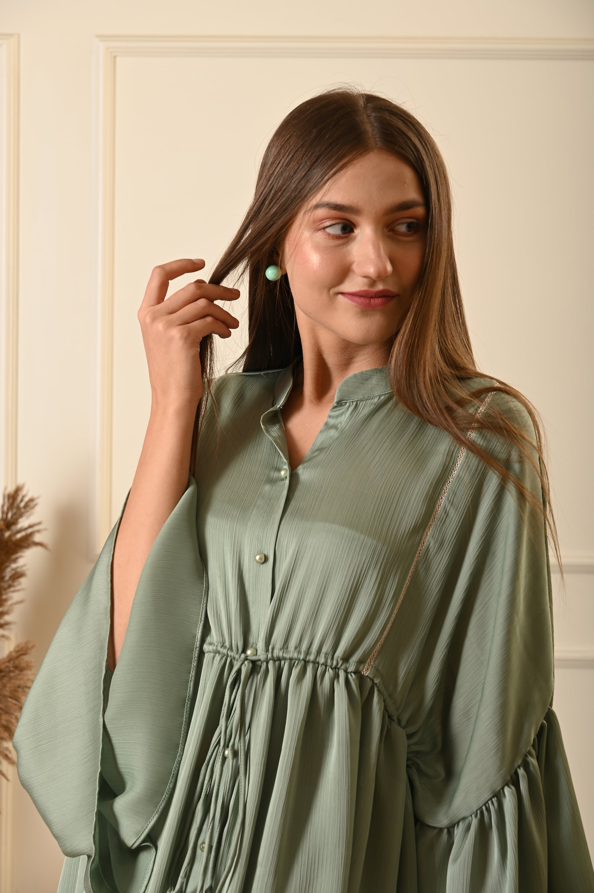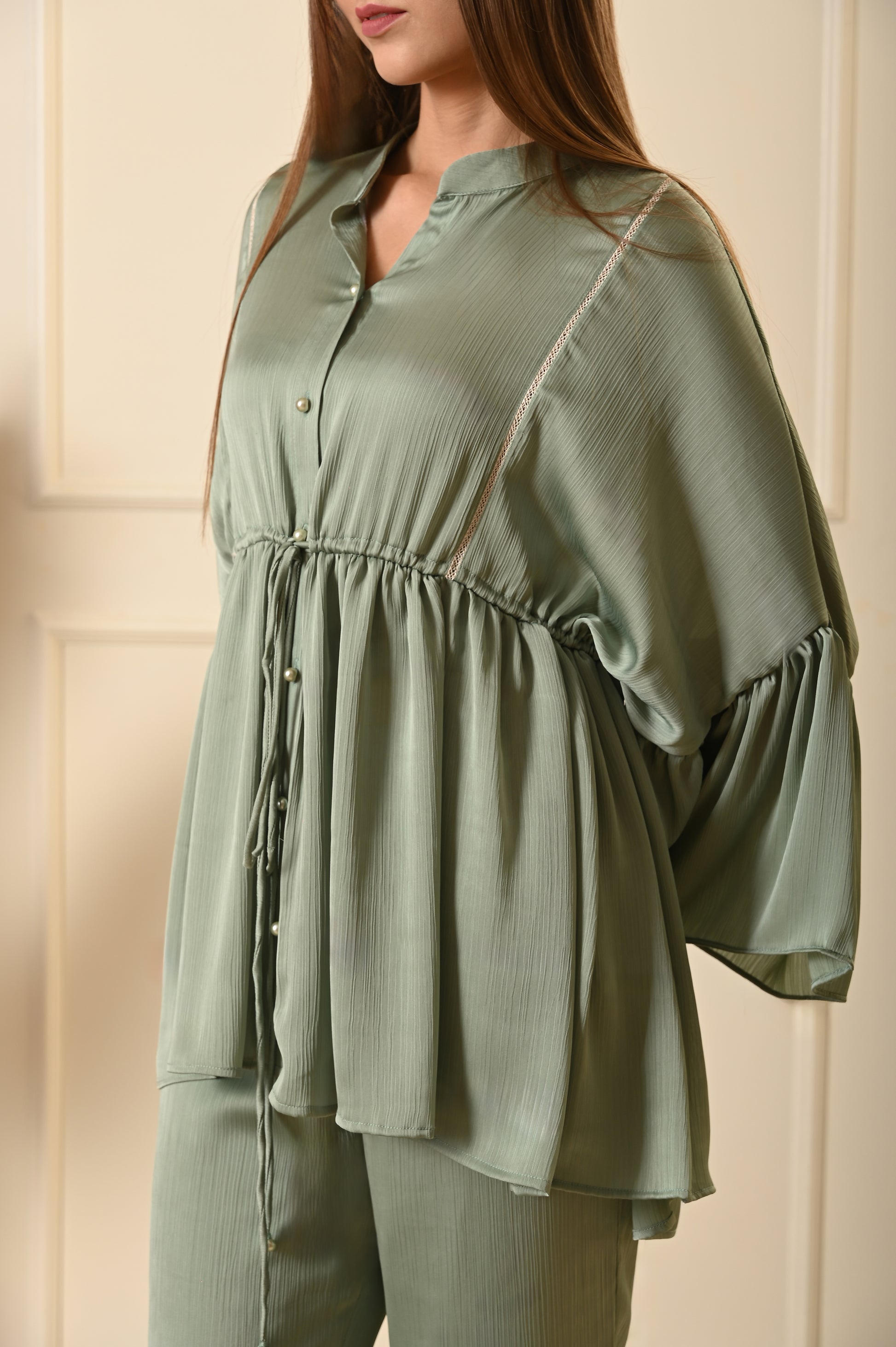 - Coordinating pearl buttons and lace accents on both sides of the blouse above the empire line.