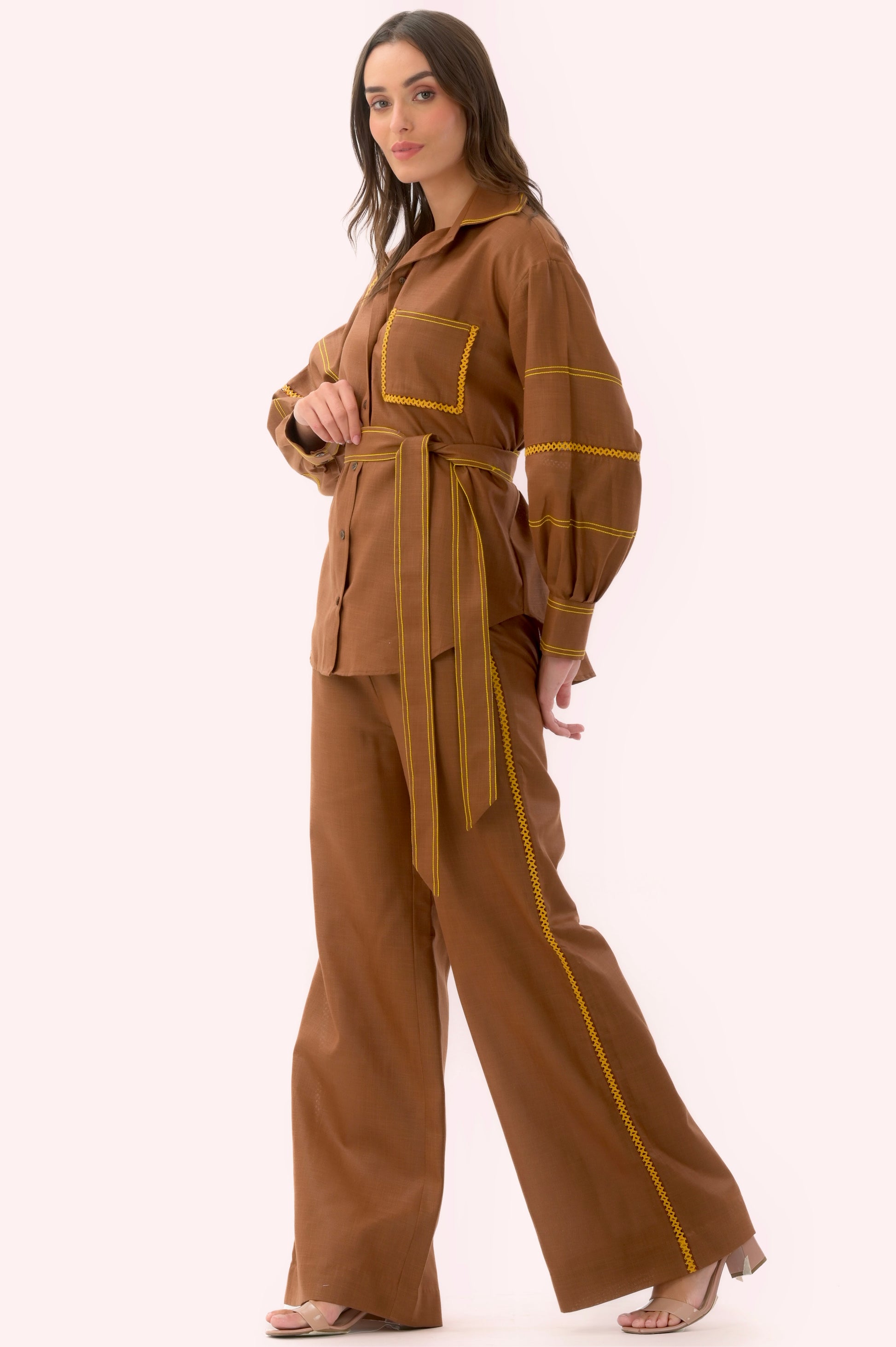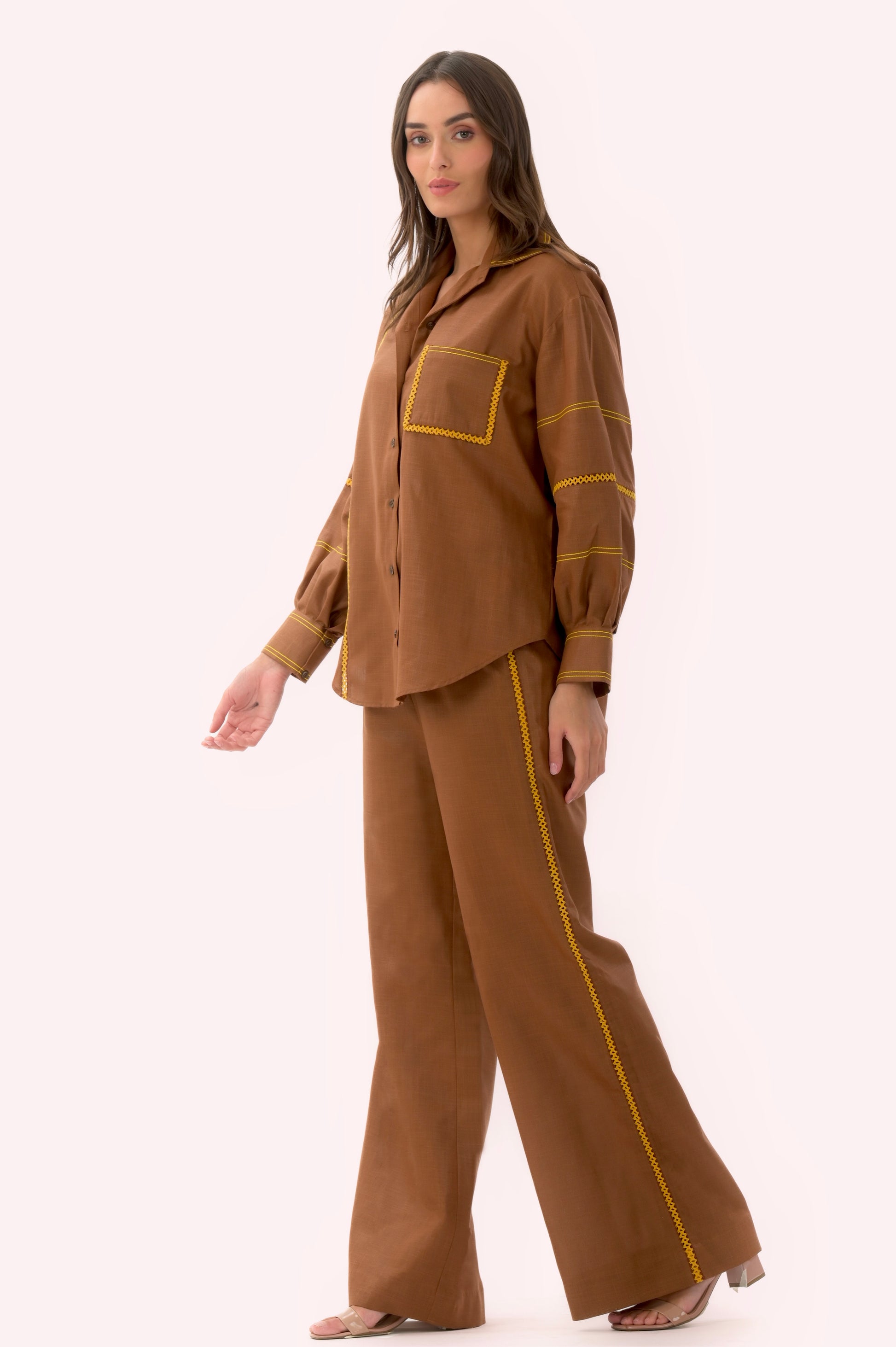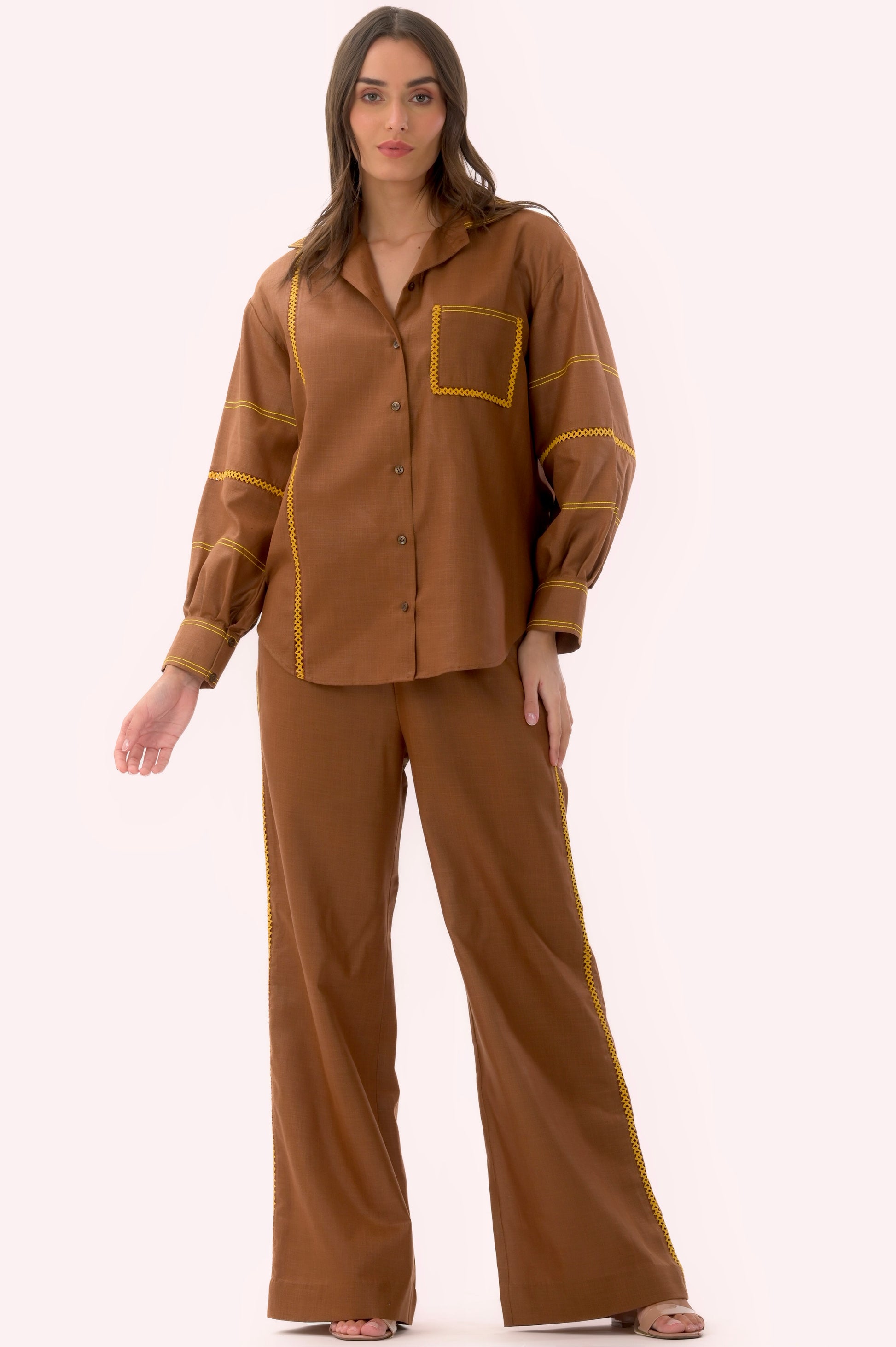 Brown sugar cotton coord set features a warm and earthy brown hue, complemented by vibrant yellow finishing details, creating a truly eye-catching combination. Experience the perfect blend of sweetness and sunshine as you don this distinctive coord set, designed to make a statement and bring a touch of joy to your wardrobe.