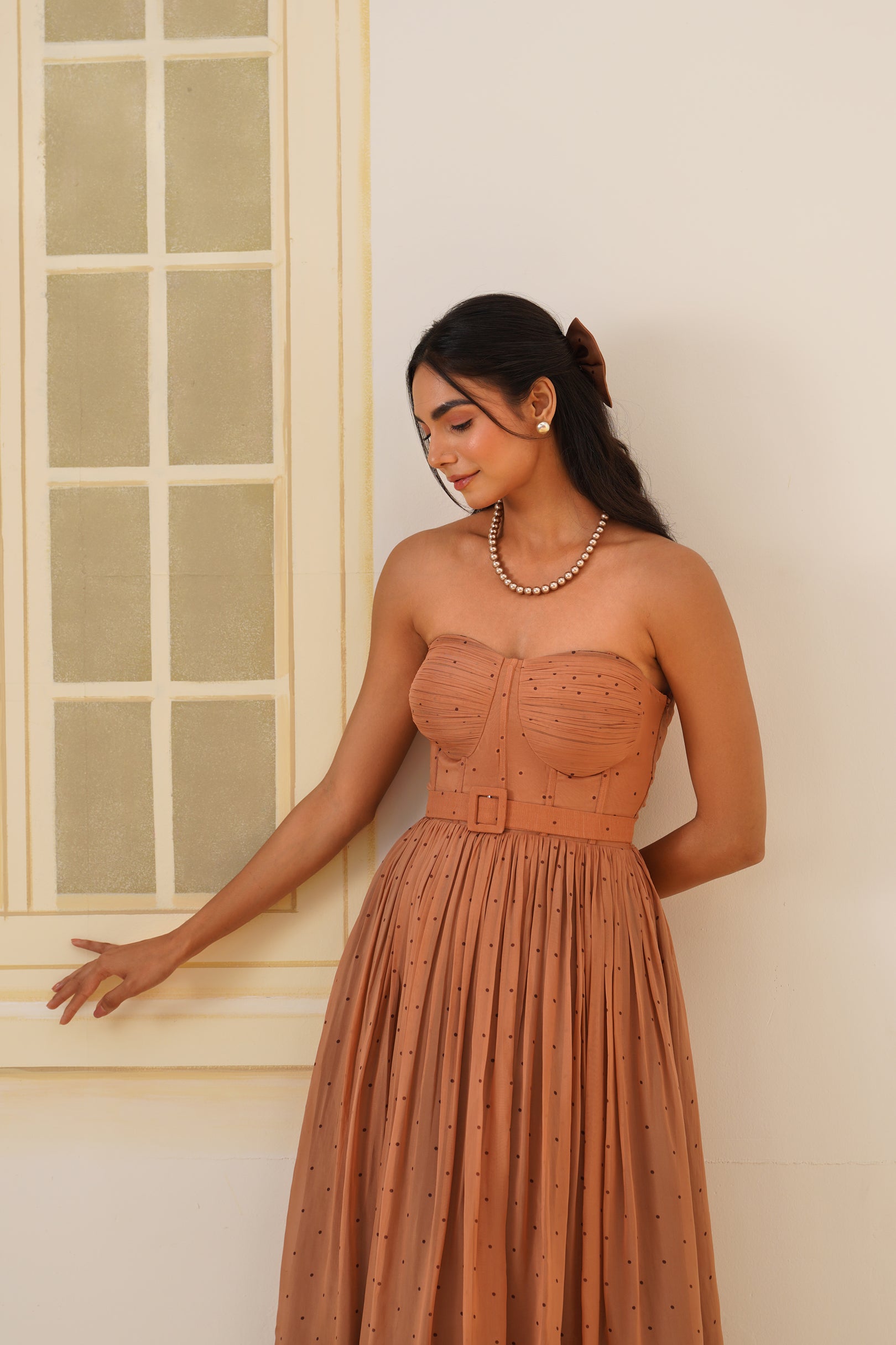 • Corset-style bodice with built-in pads for structured support