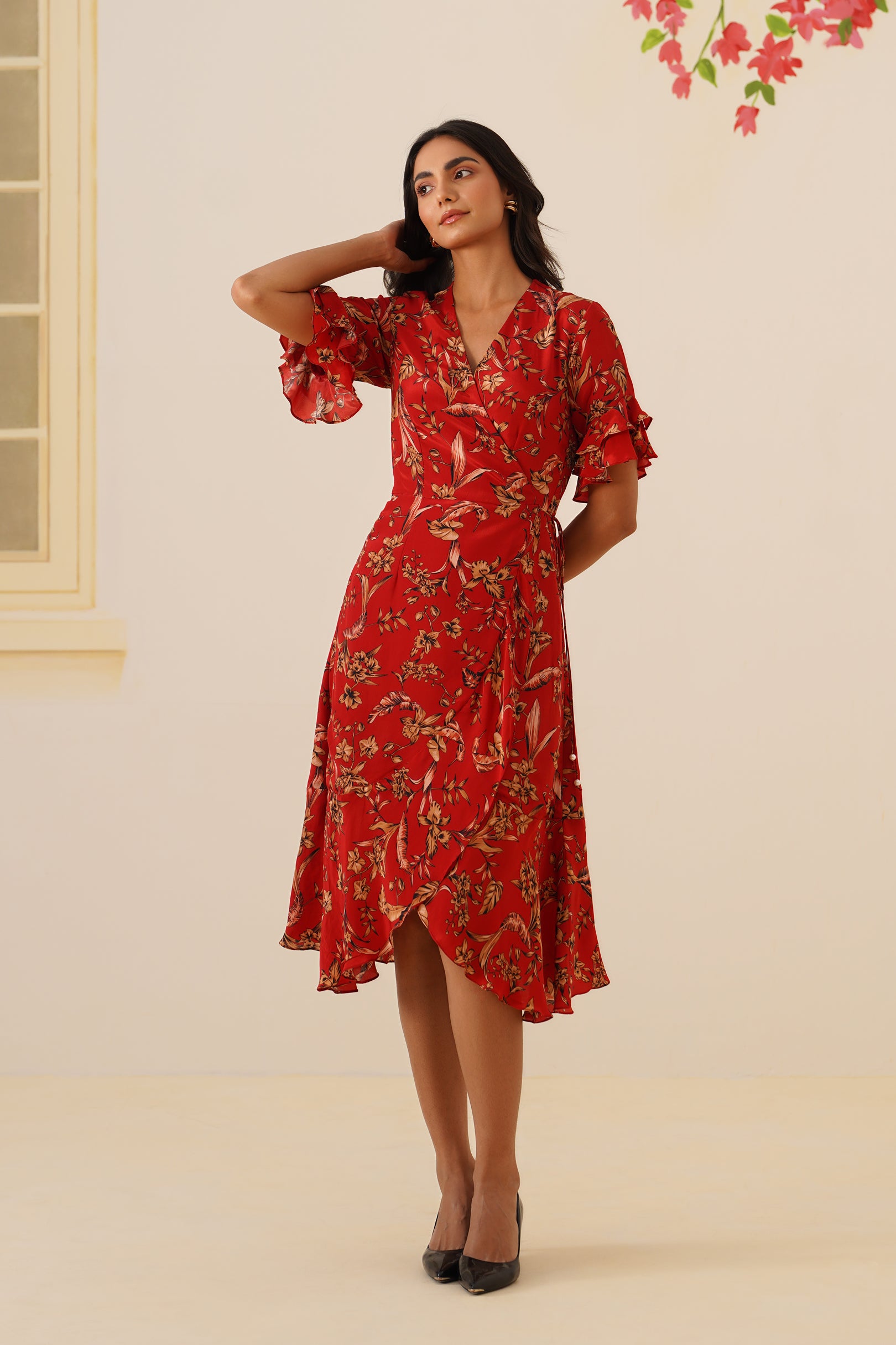 • Midi-length wrap dress with a flattering high-low hem (Length: 47 inches)