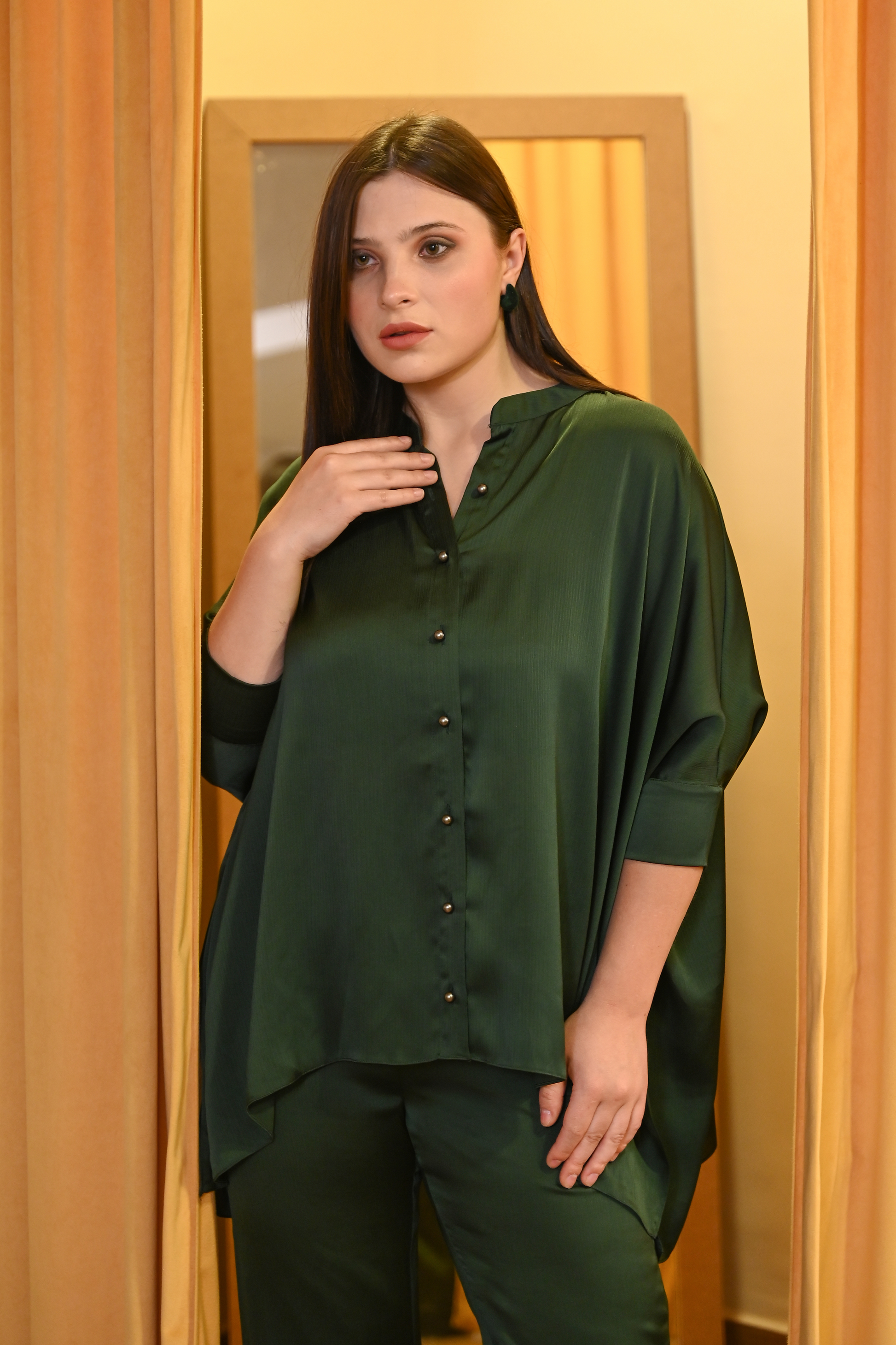 Asymmetrical flowy and flared blouse with cuffs on 3/4th length . Matching pearl buttons to for a tied closure. Easy silhouette Suitable for allbody type Flare pants with half elastic half belt for comfort