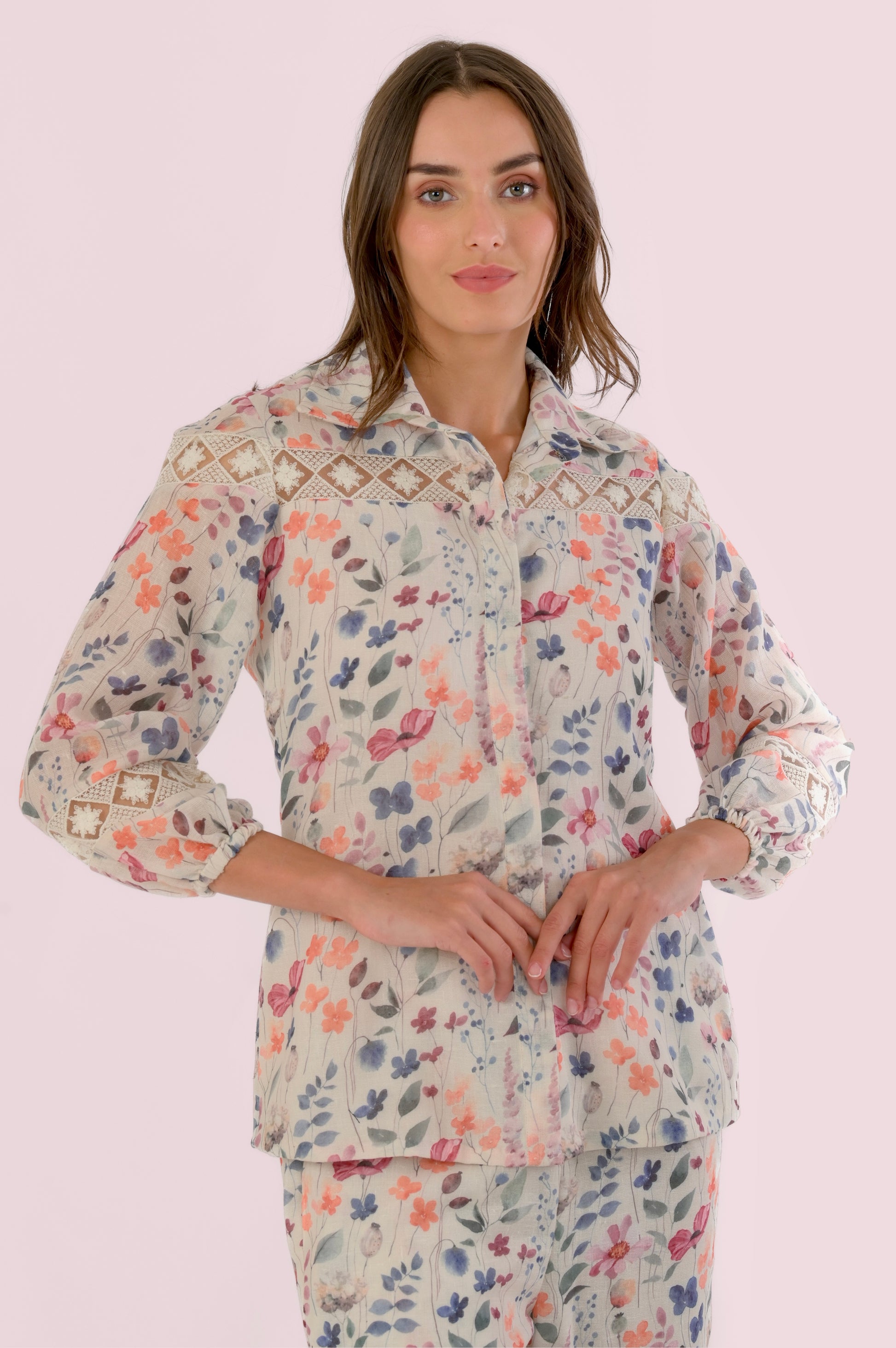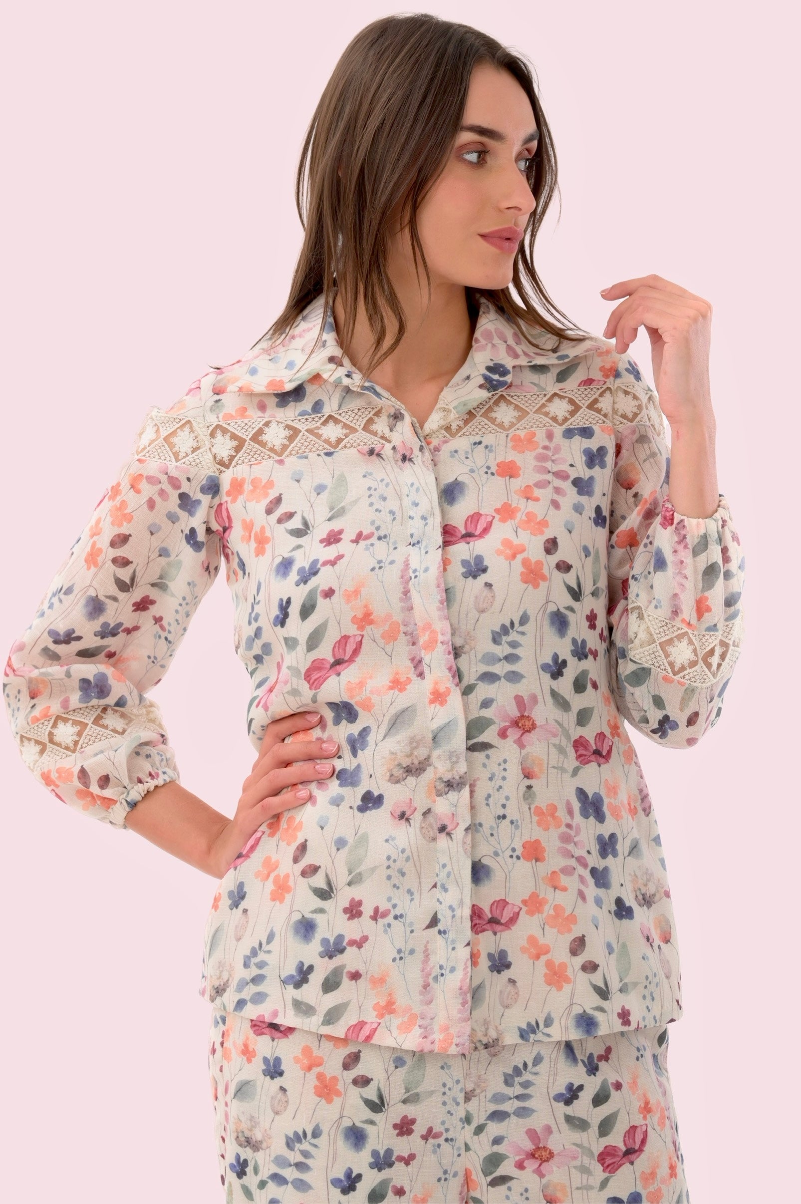 White linen coord set adorned with blooming petal prints. The delicate floral pattern adds a touch of elegance and femininity to the ensemble. Complete with ethereal organza lace detailing on both the top and pants, this coord set exudes a sense of grace and sophistication. Step into a world of blossoming style with our white linen coord set, designed to make you feel like a vision of enchantment.