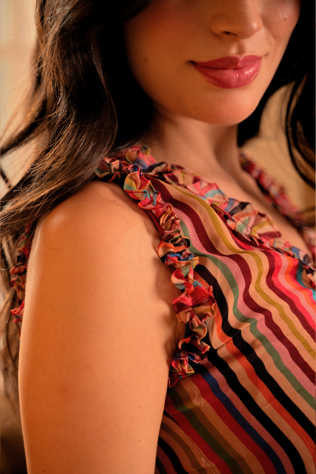 - Top: Cut-sleeve crop top with frills on the neckline and armholes for a stylish finish