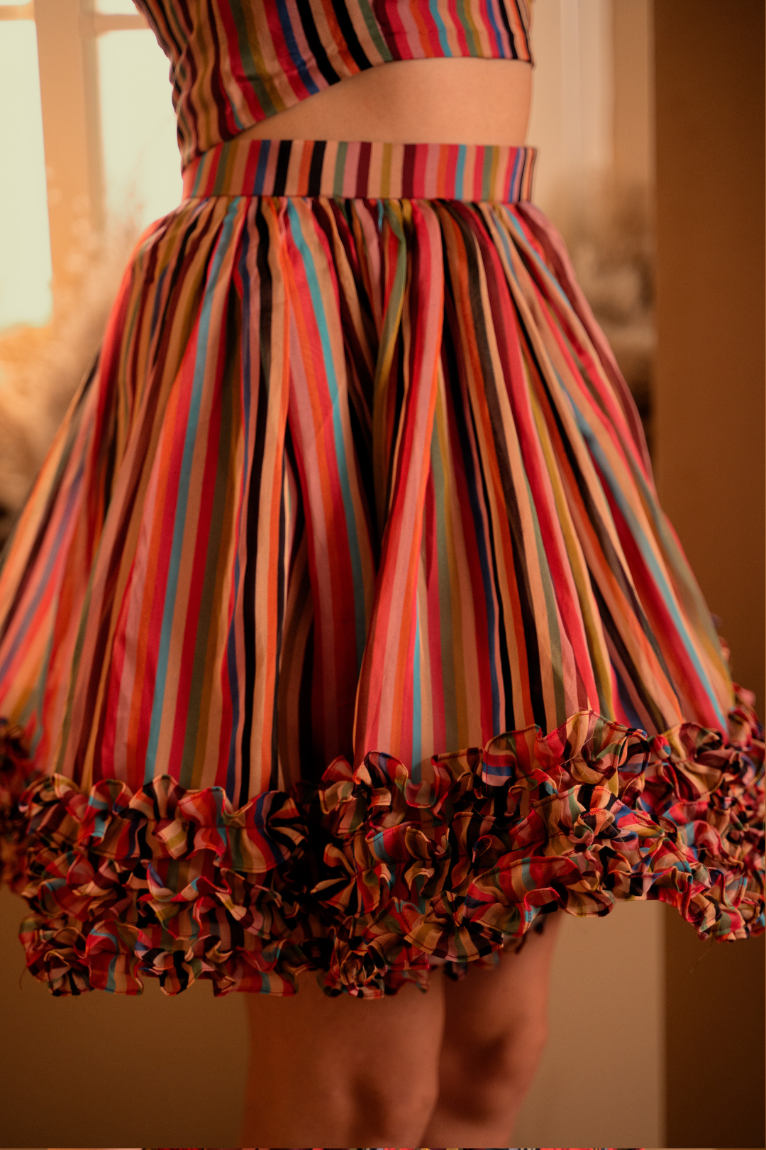 - Skirt: Skater skirt with gathers and frills at the hem for a chic look
