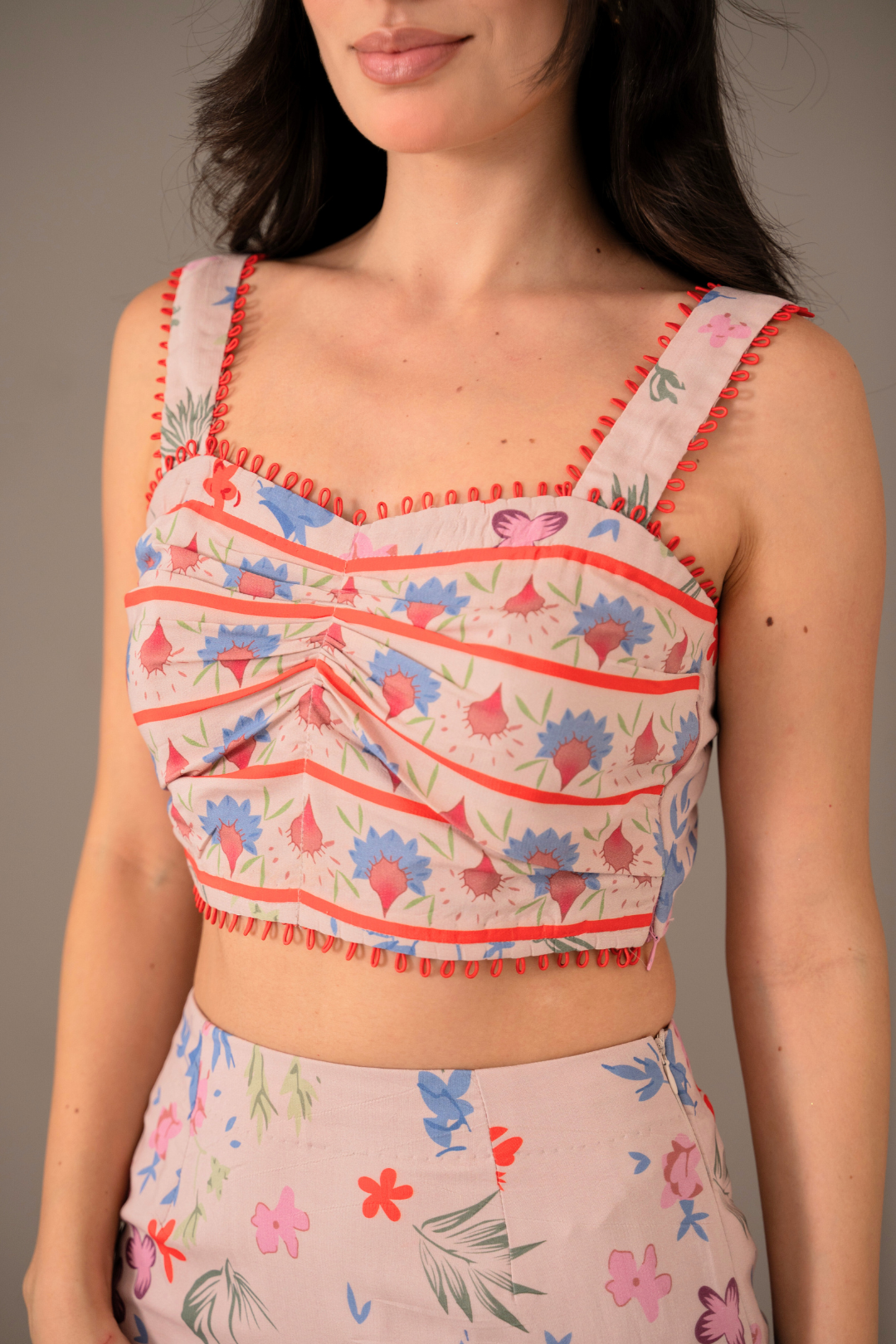 - Crop top with loop lace detailing on the front and straps for a stylish look