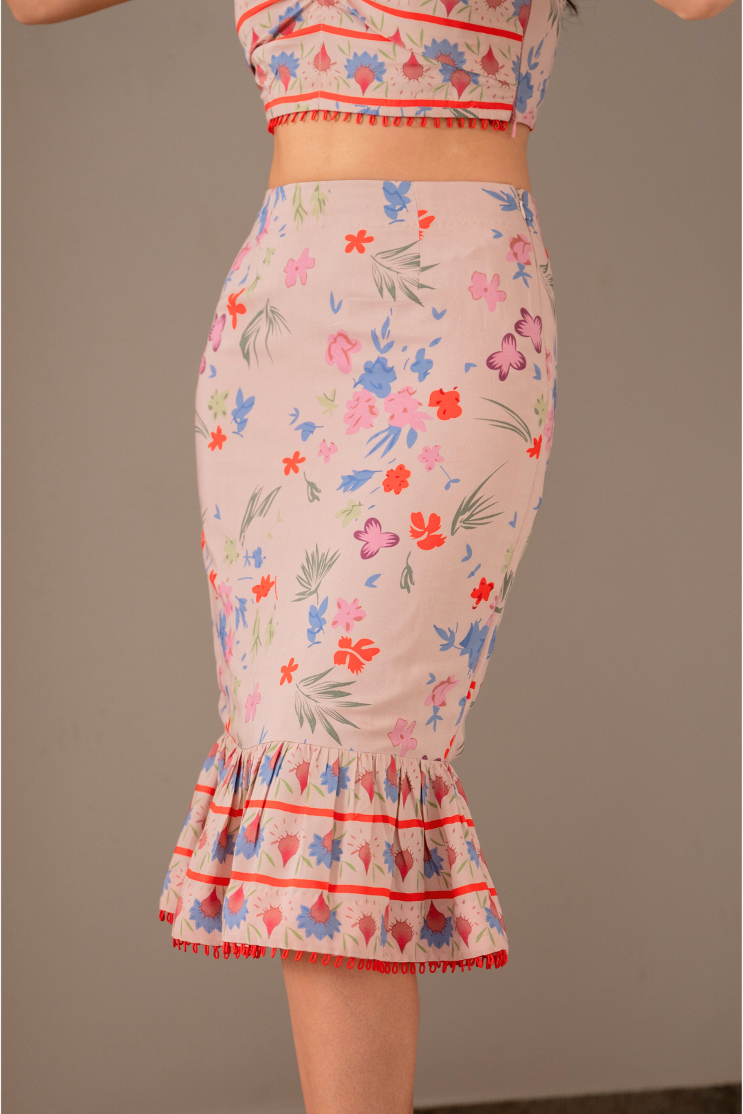 Design: Two-piece set featuring a crop top and a fish-style skirt