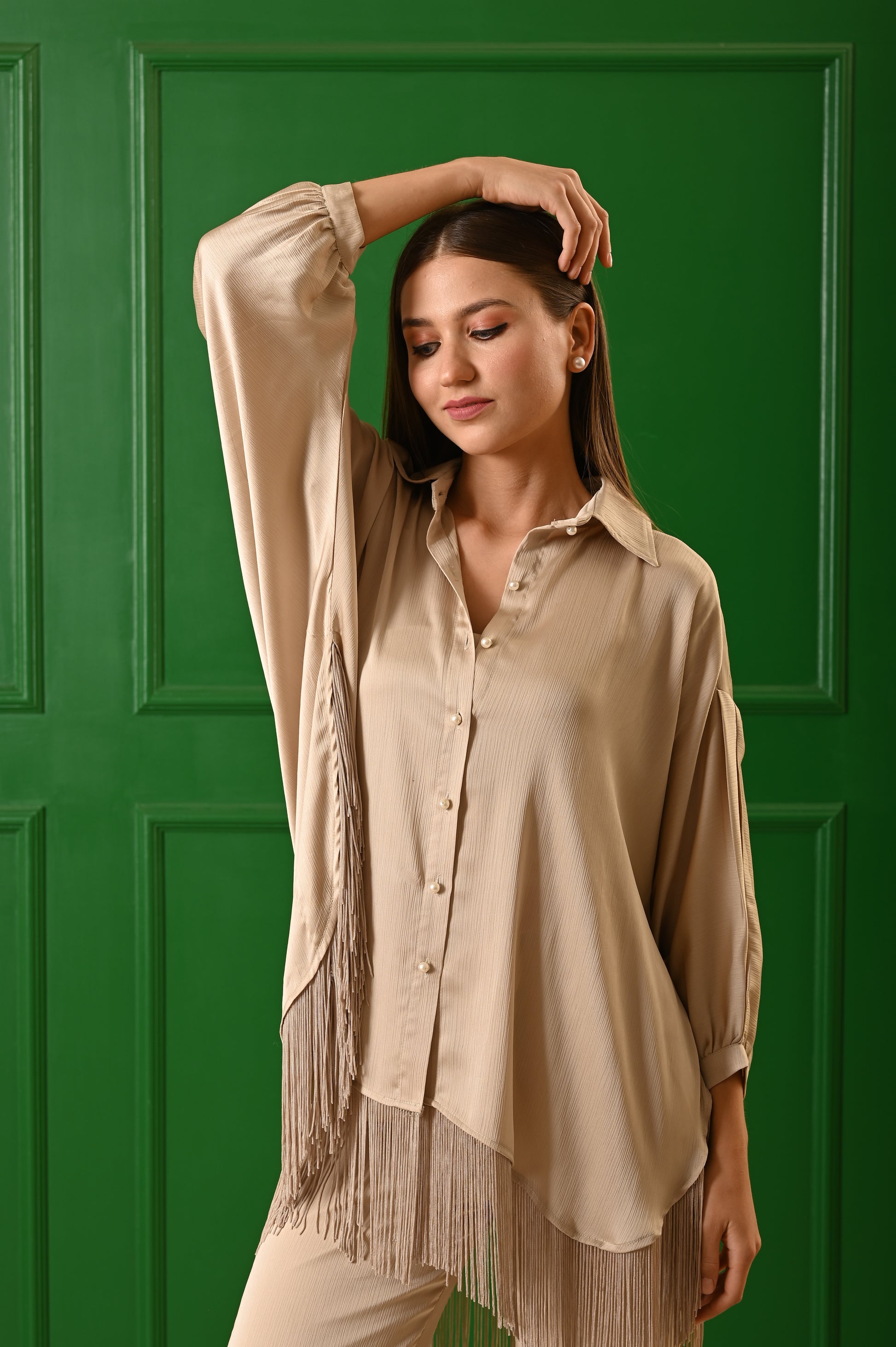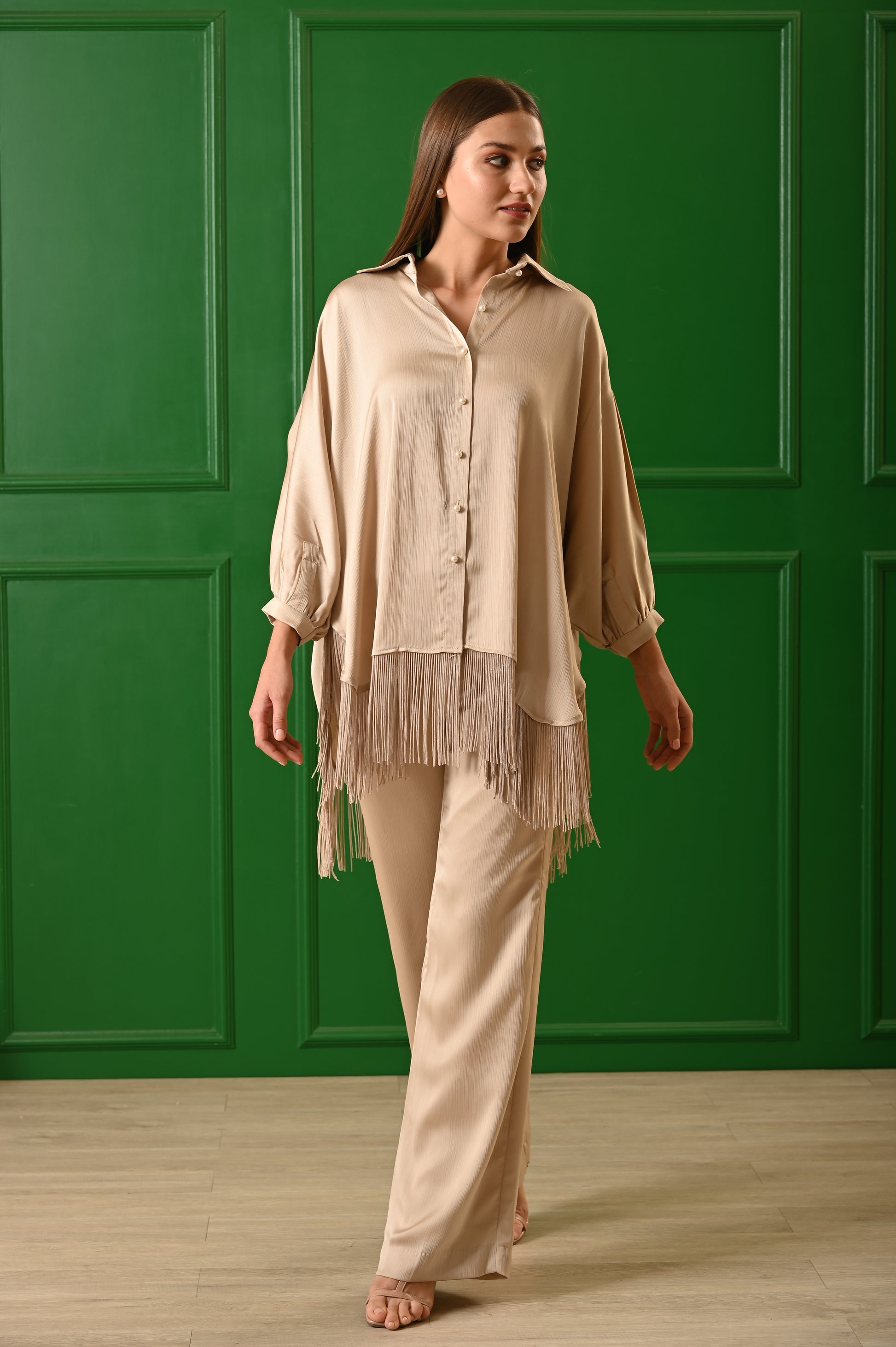 Relaxed fit front open kimono style top with curved hem. Fringes added for some movement. 3/4th sleeves Coordinating pearl buttons for a tied closure. Comforting silhouette Flare pants with half elastic half belt for comfort