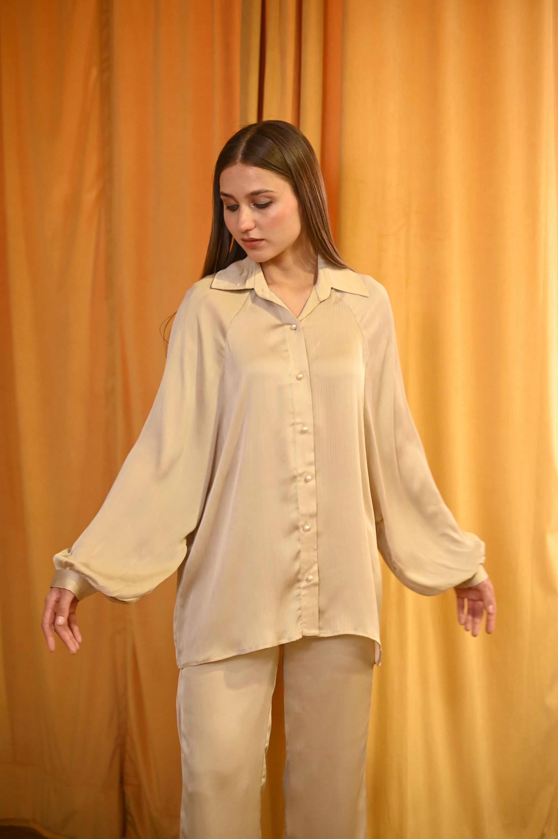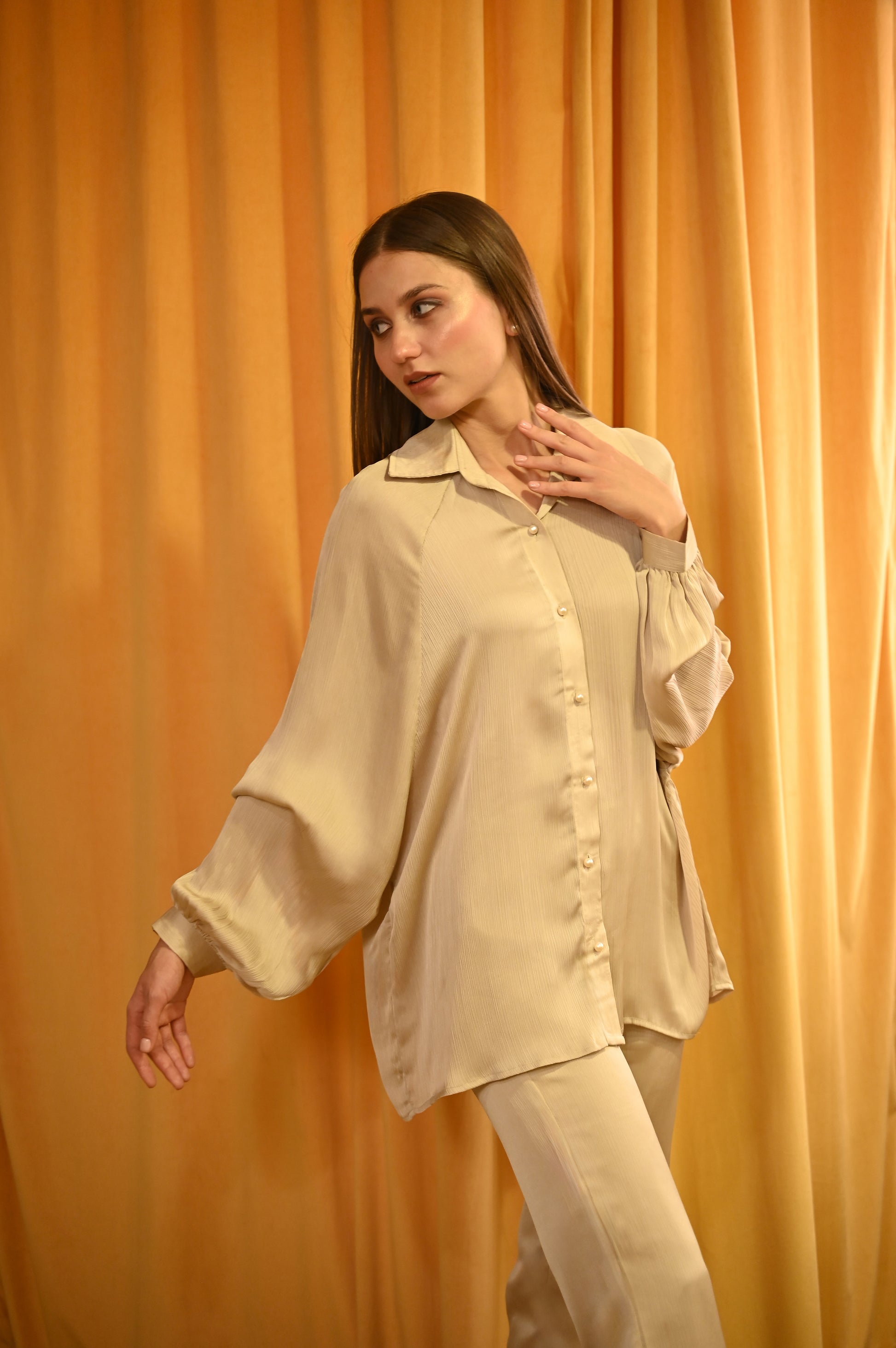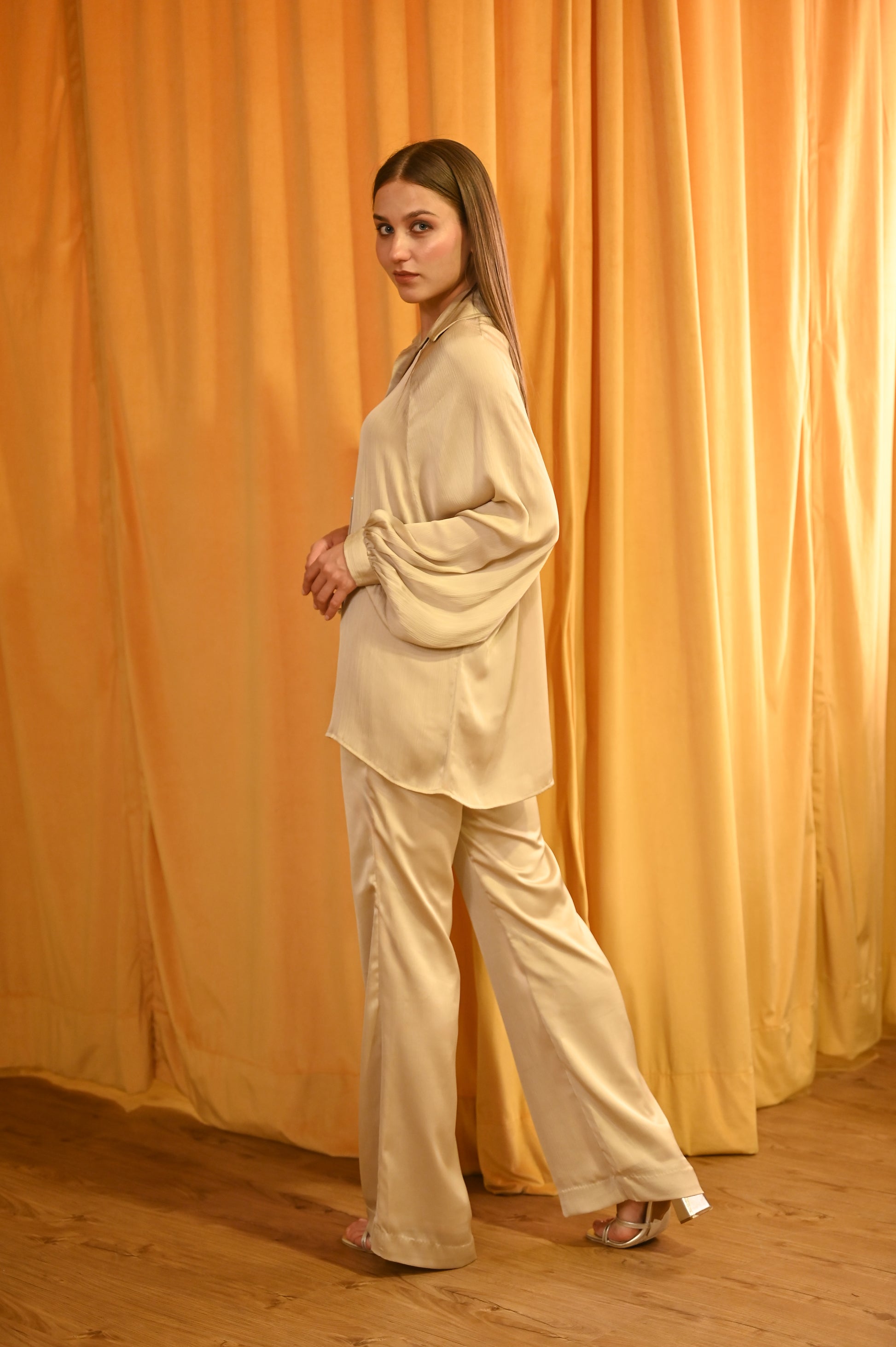 Front-open shirt-style with cross balloon full sleeves for a distinctive ensemble. Matching coordinating pearl buttons. Suitable for all body types. Free form flowy silhouette Flare pants with half elastic half belt for comfort