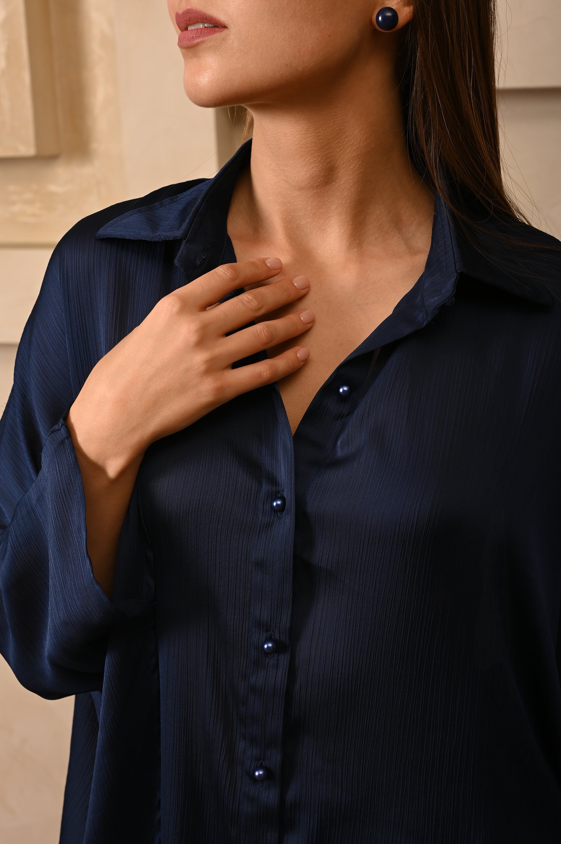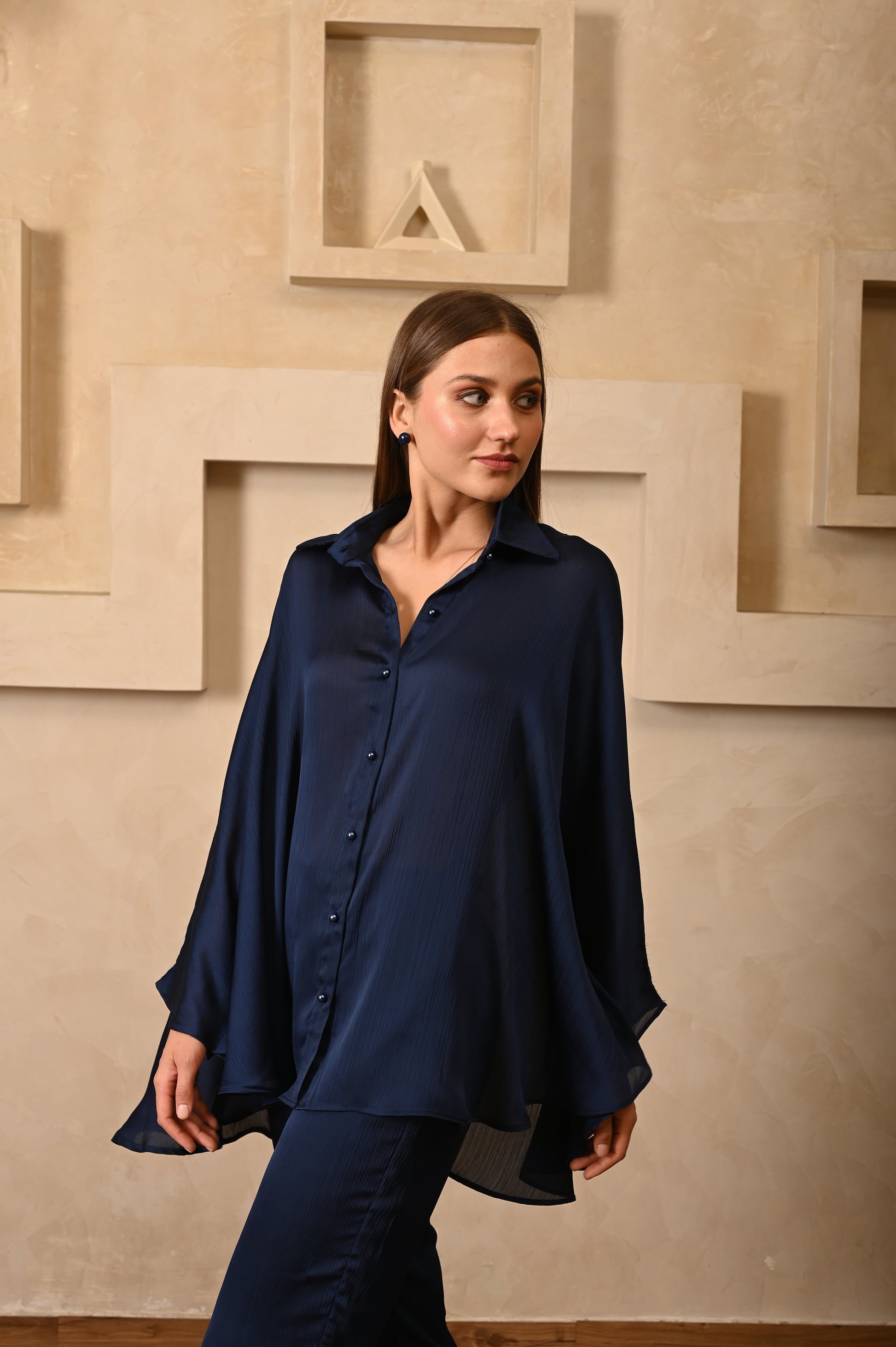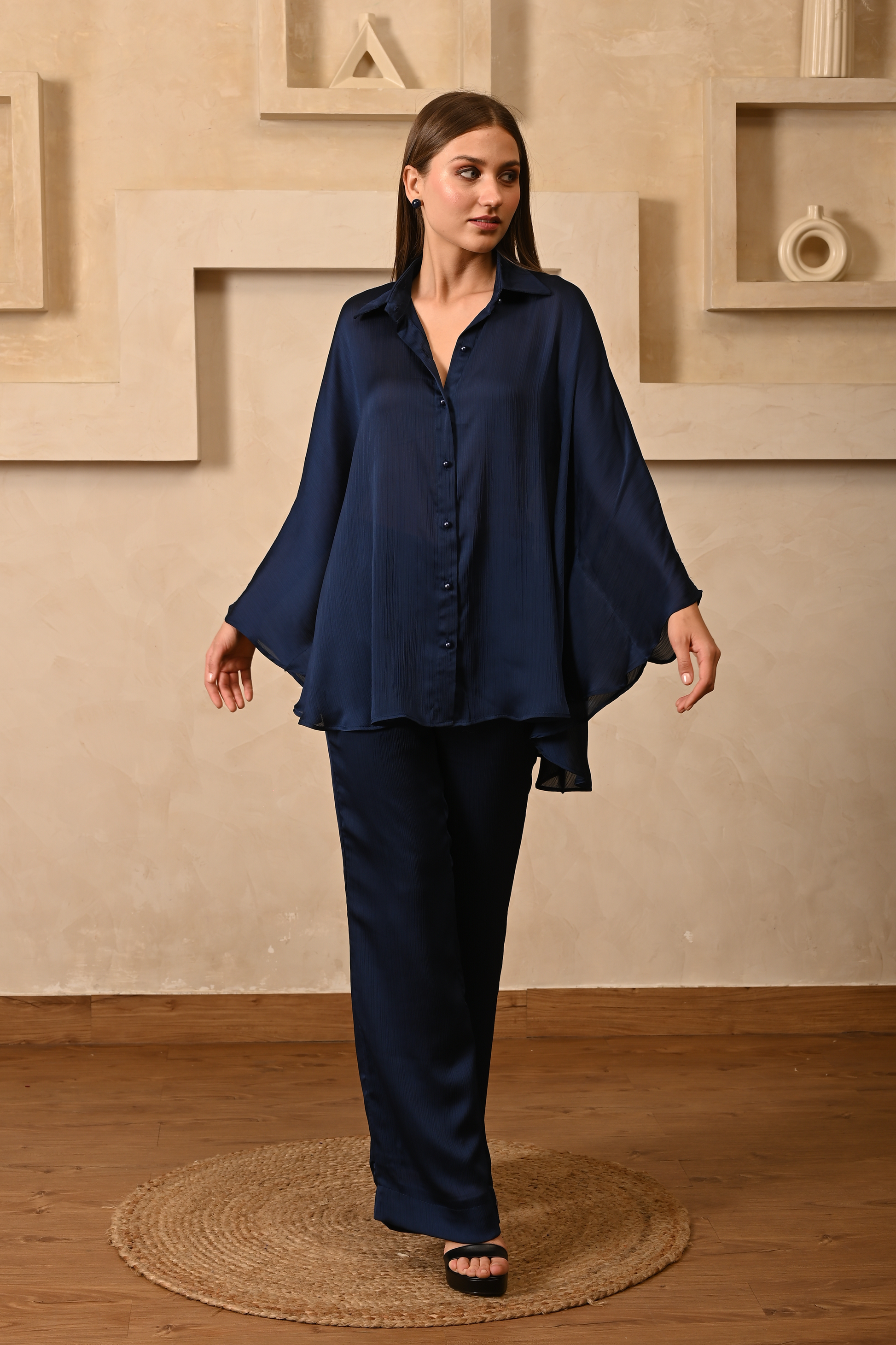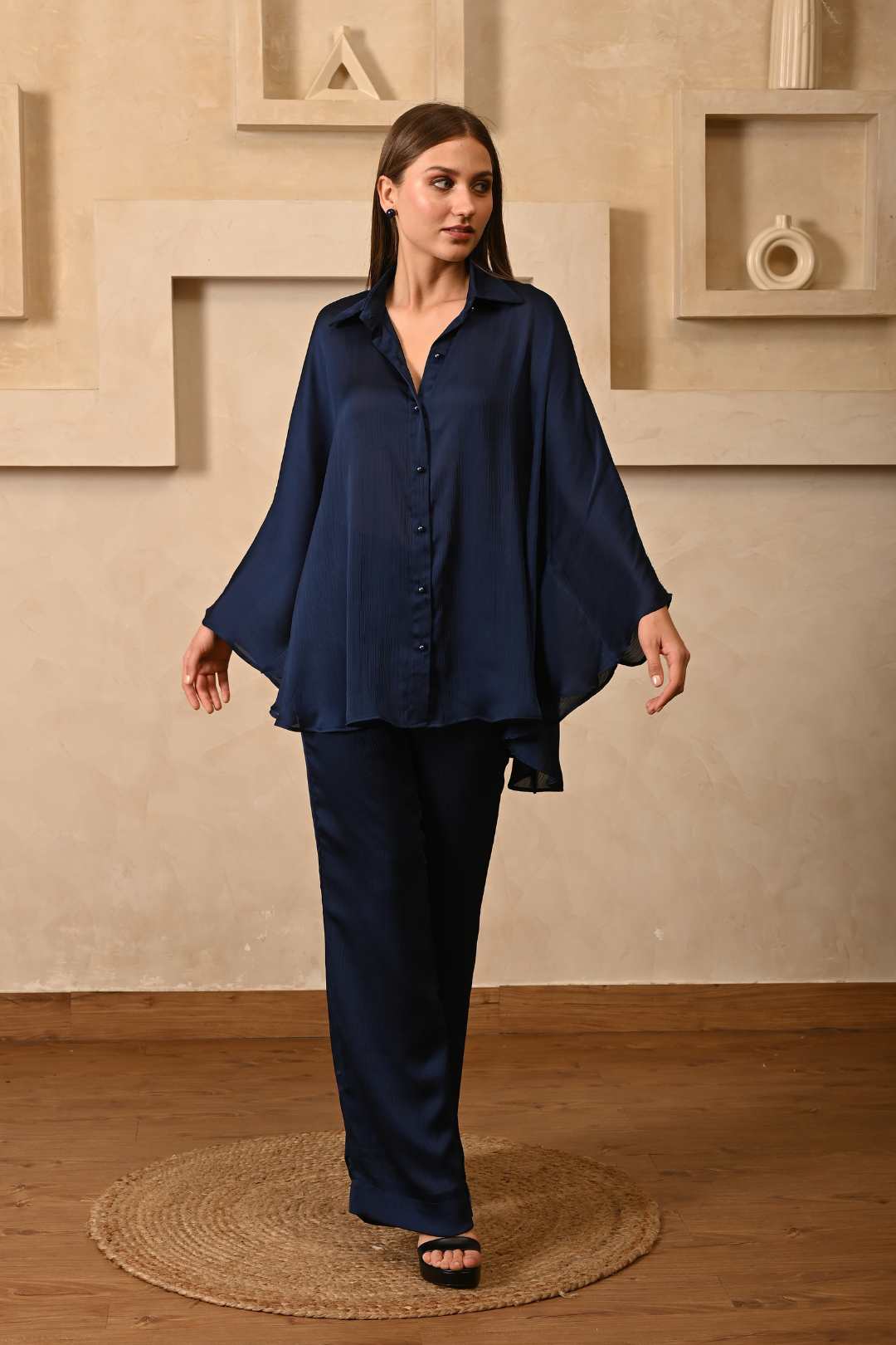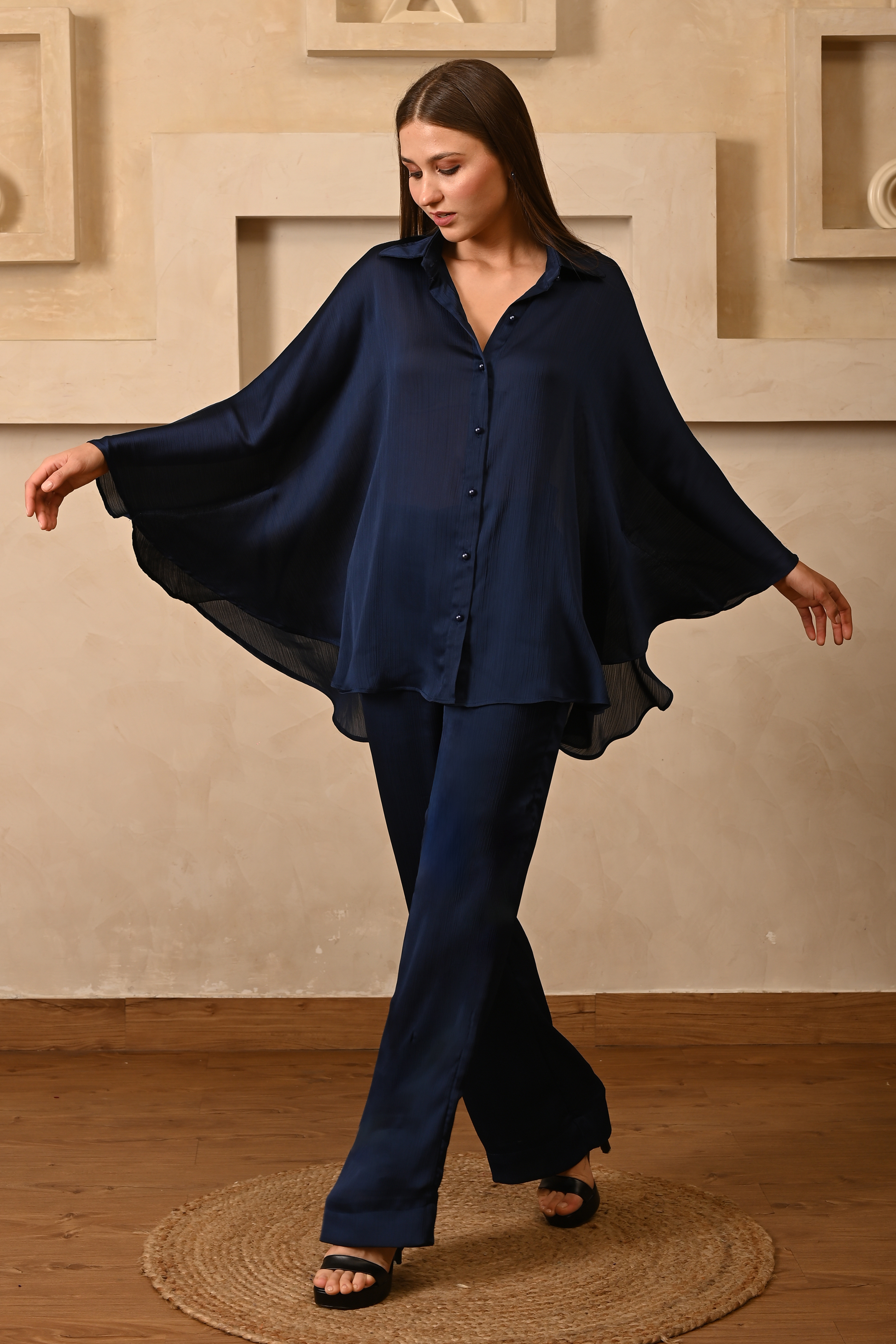 Front-open, flattering shirt-style cape with a longer back hem for a stylish and dynamic silhouette. Matching coordinating pearl buttons. Suitable for all body types. Free form flowy silhouette Flare pants with half elastic half belt for comfort