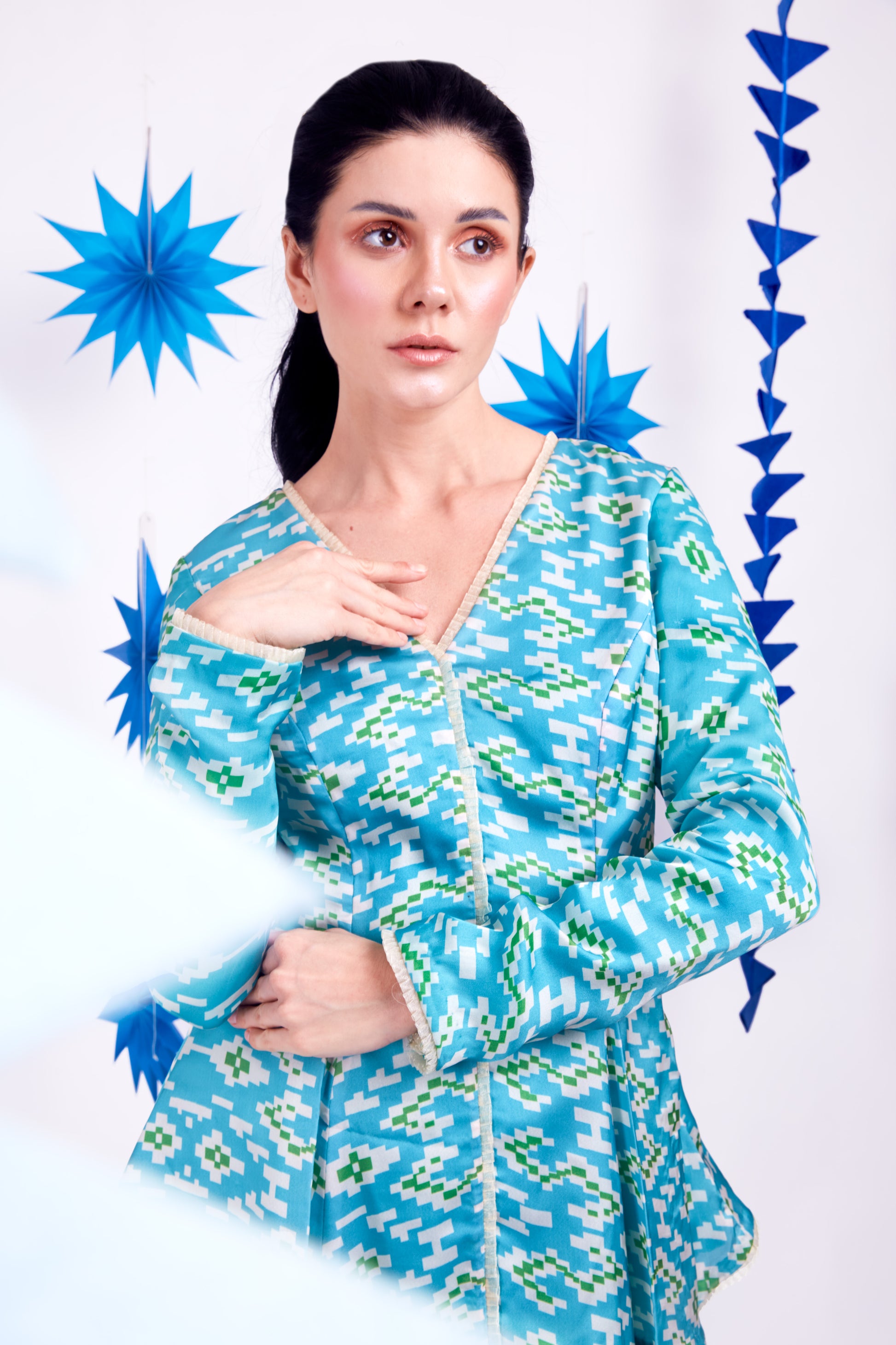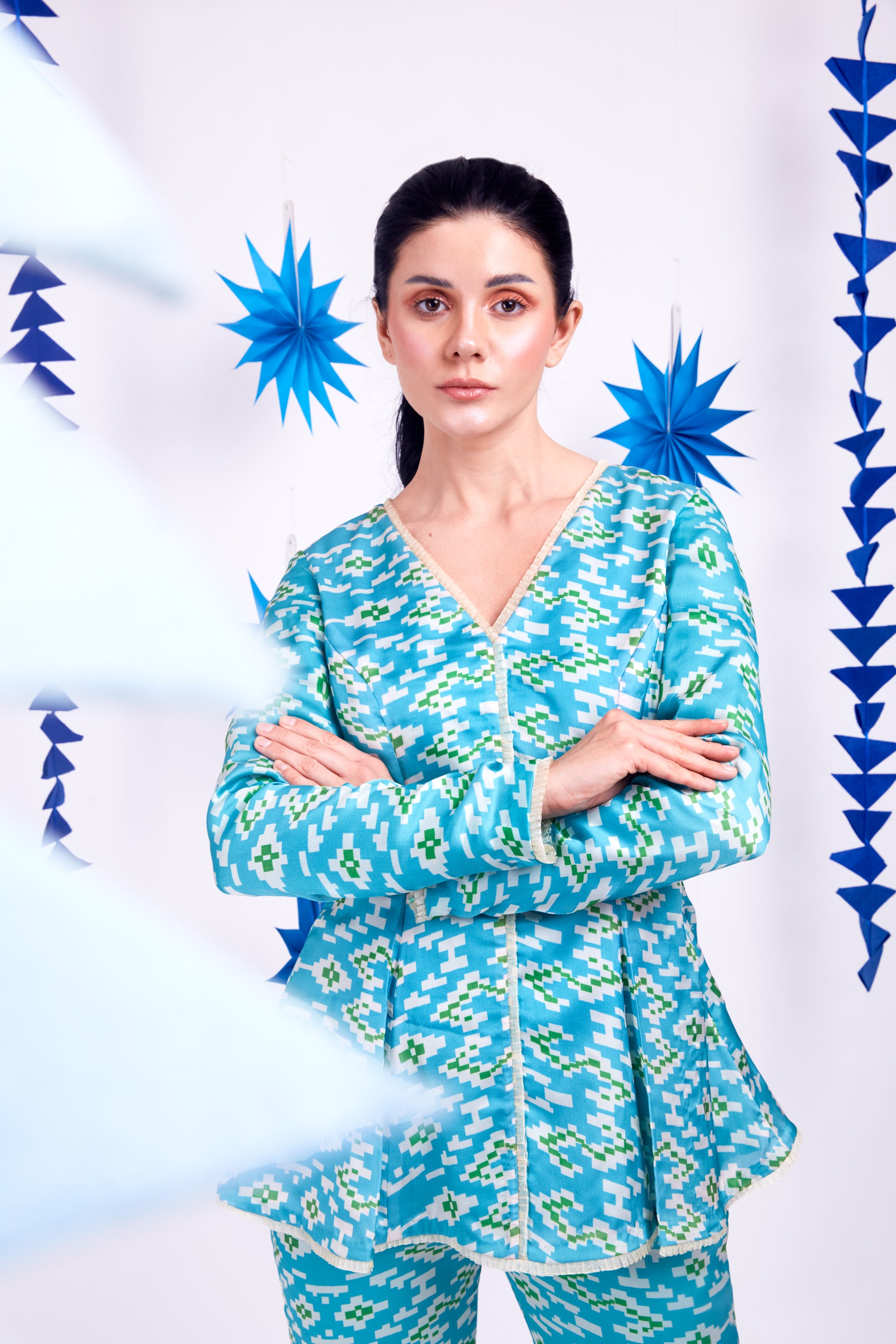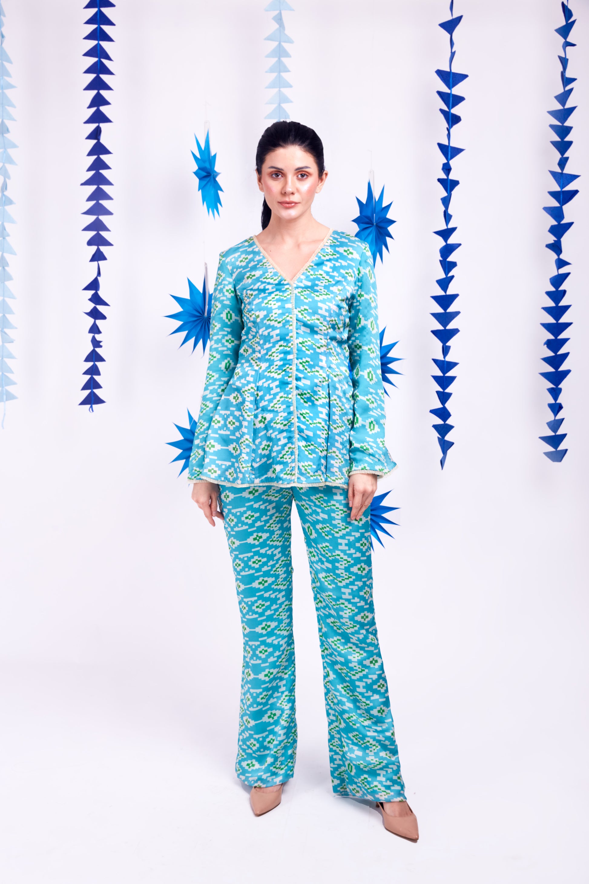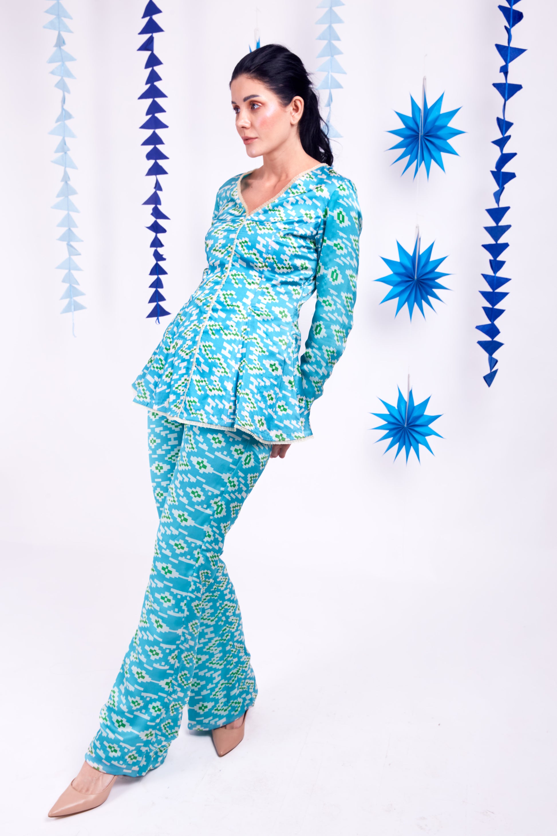 - Geometric print princess cut peplum co-ord set