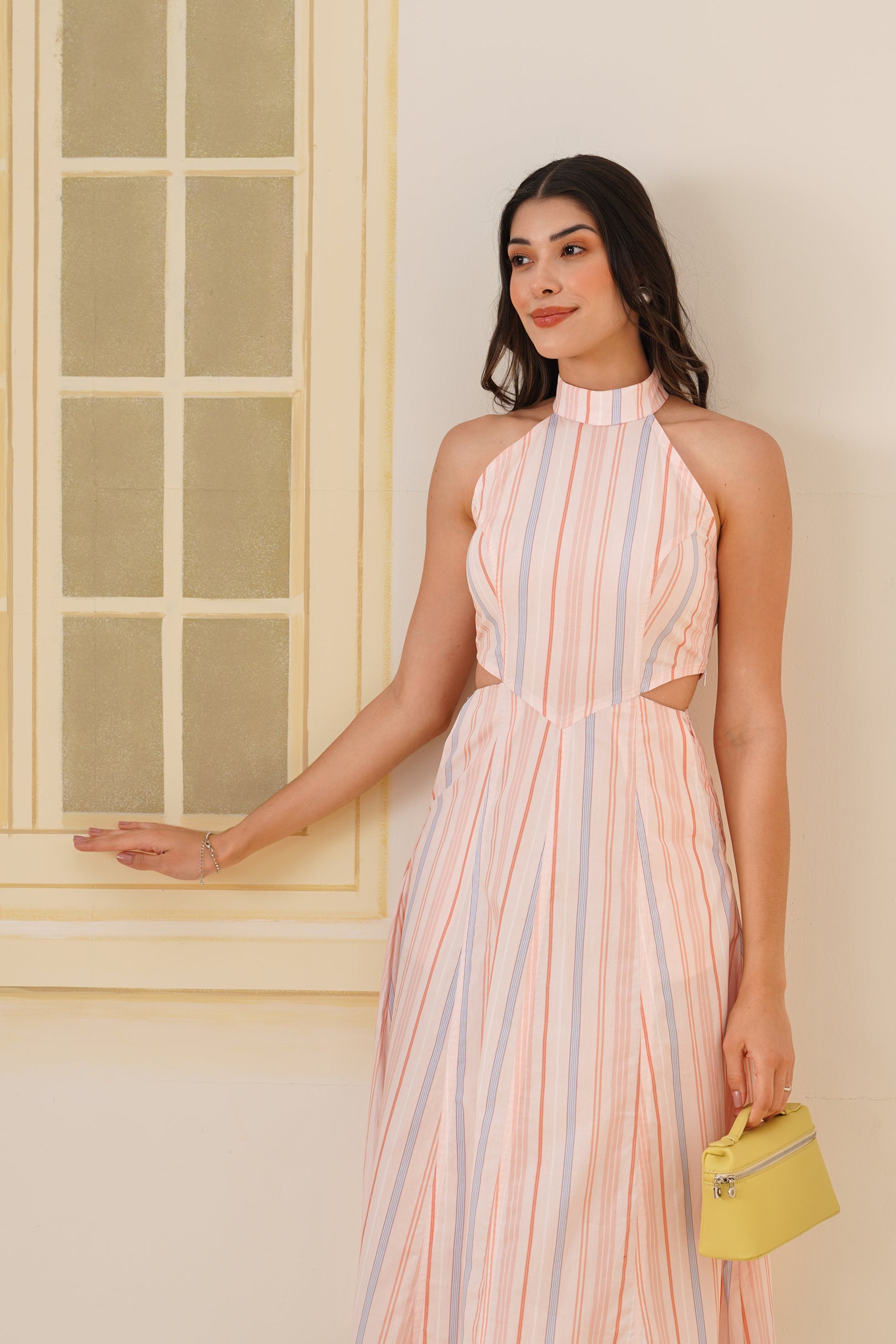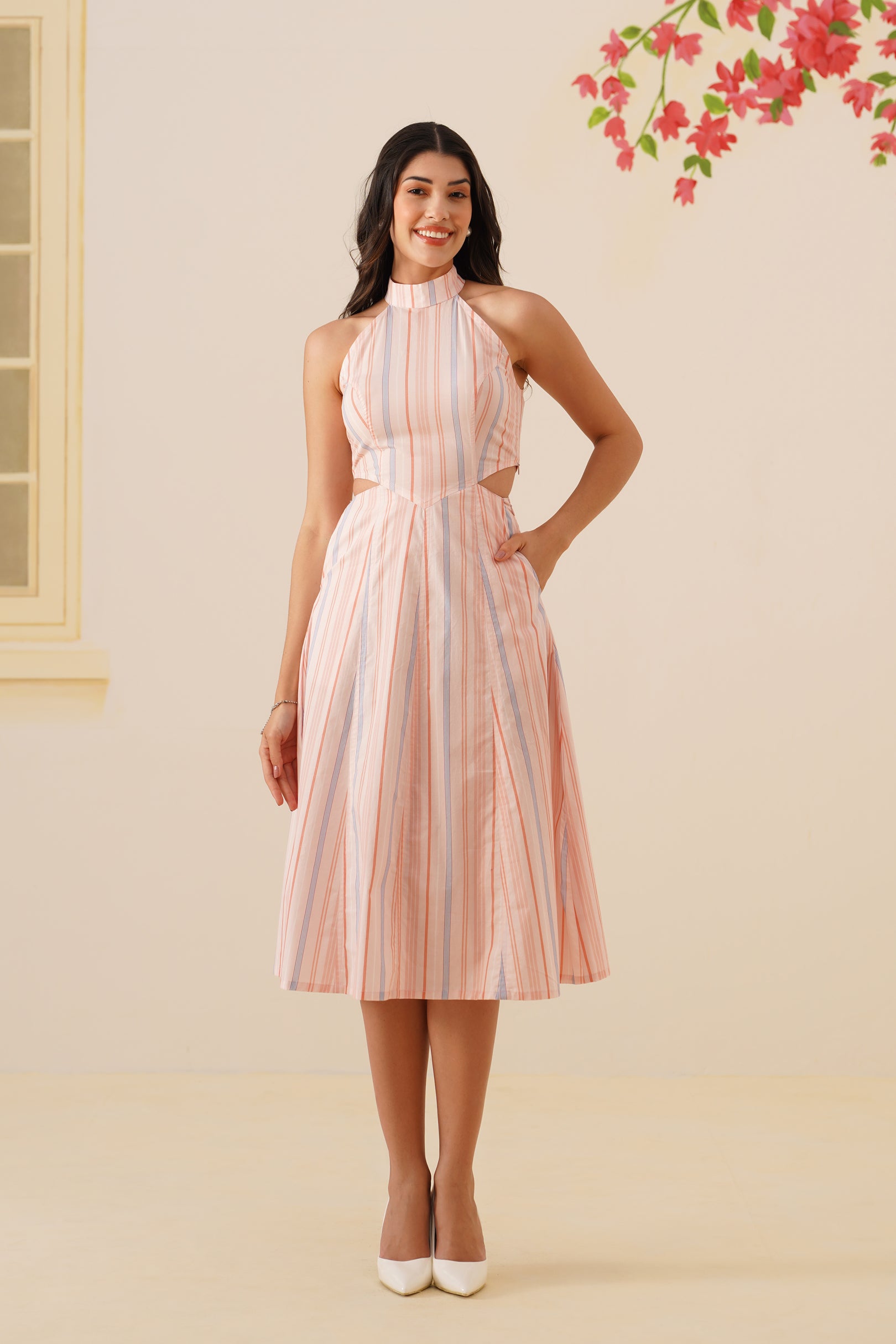 • Chic halter neckline with a back button closure at the collar