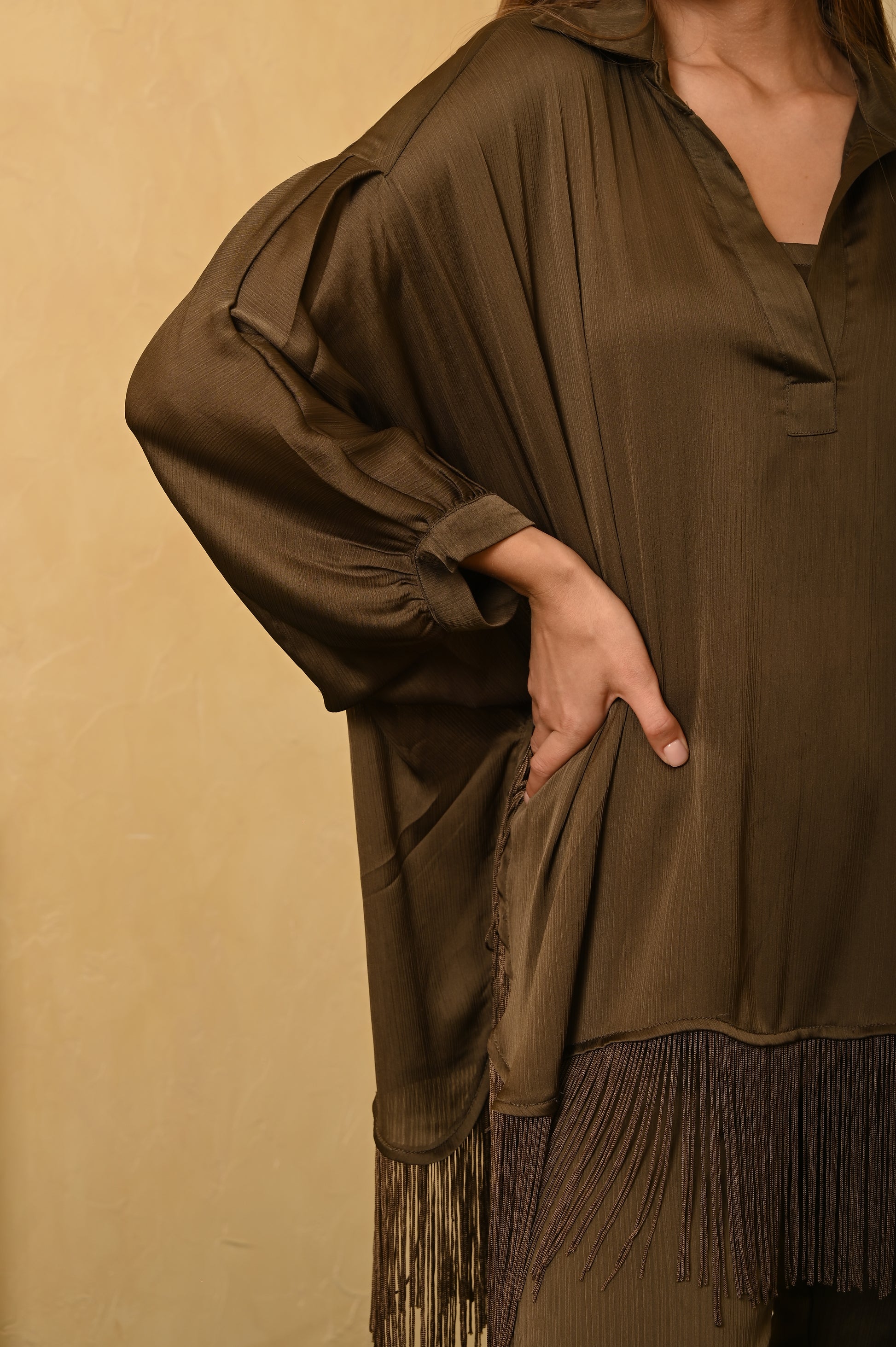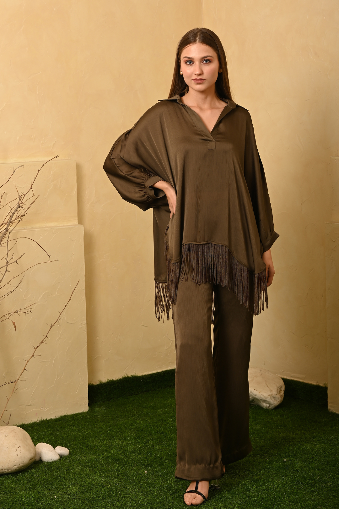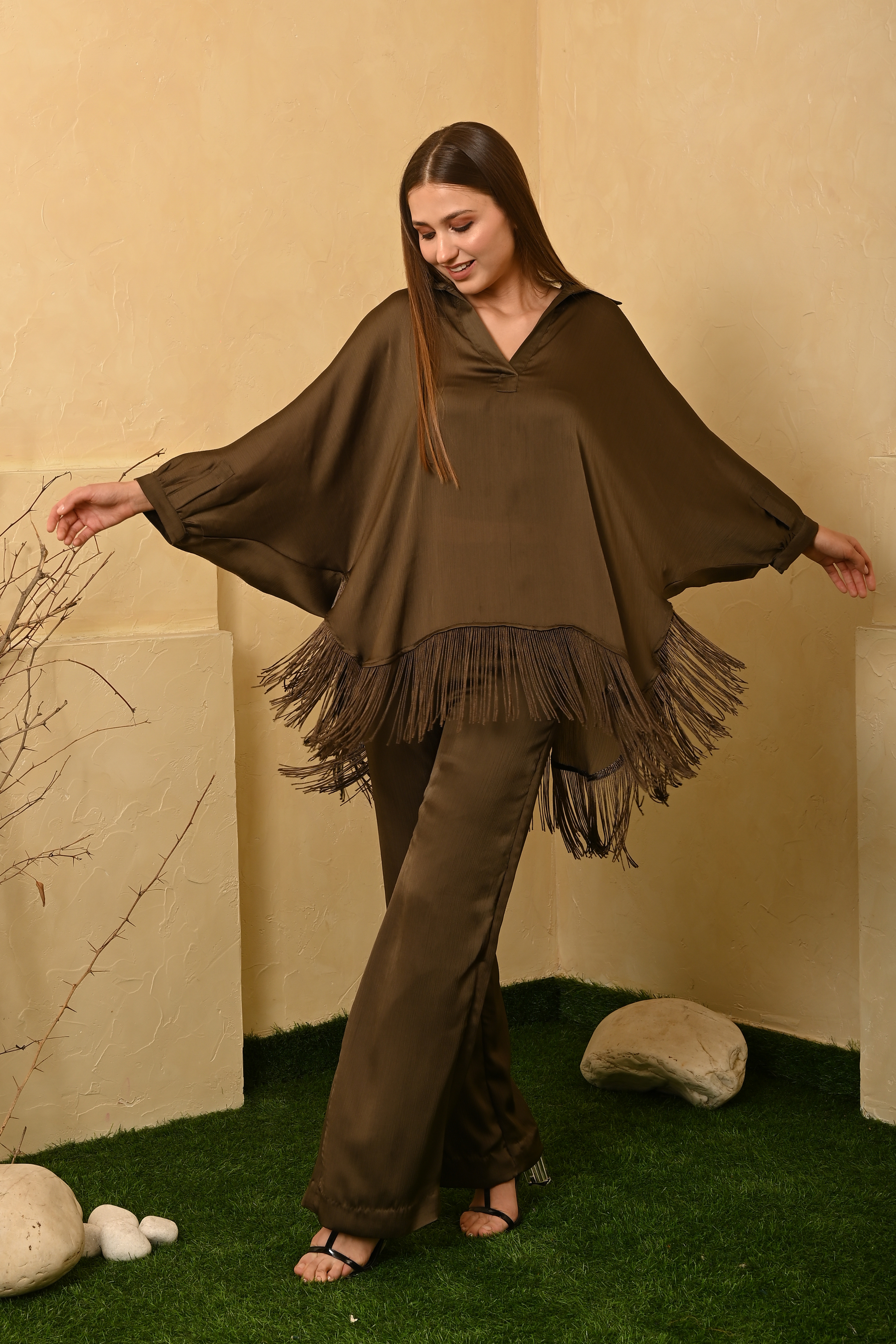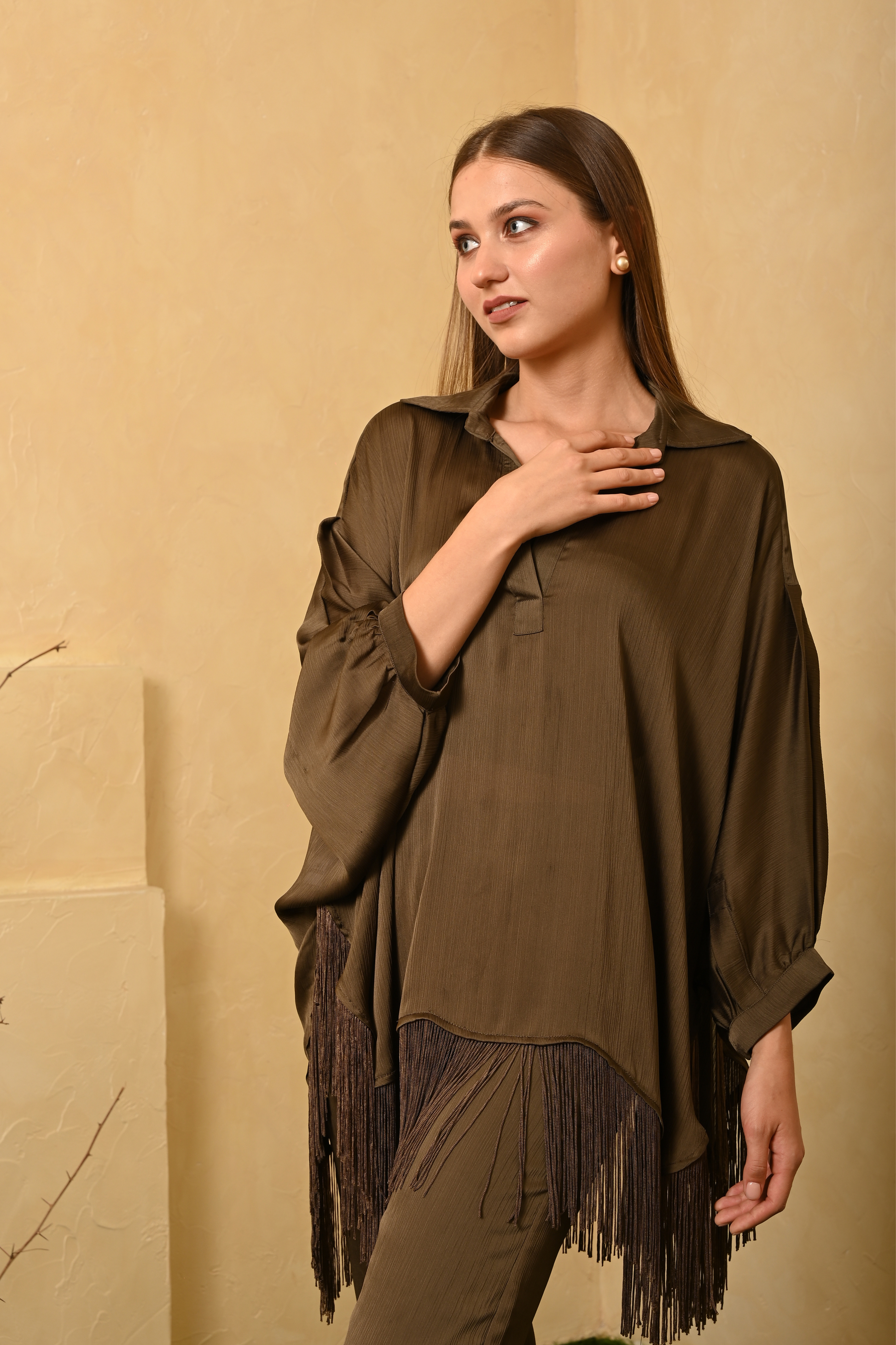 Typically well cut,form fitting ,relaxed fit top. Fringes added for some flare. 3/4th sleeves. Suitable for all body types. Free form flowy silhouette Flare pants with half elastic half belt for comfort